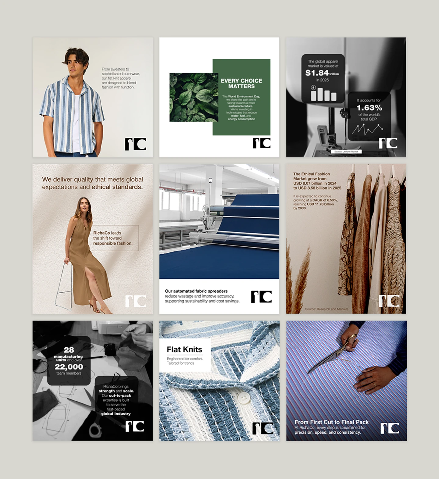 Our content mix spans people-first storytelling, ethical manufacturing, sustainability, industry insights, and their unmatched scale of 28 units and 22,000+ employees. Every post is designed to balance authority with relatability, showcasing RichaCo’s credibility to clients, buyers, and employees alike.